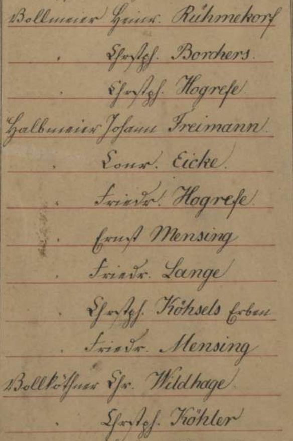 Über die Jahrhunderte hinweg entwickelte sich eine deutliche soziale Differenzierung innerhalb der dörflichen Gemeinschaften. Die Dörfer bestanden aus verschiedenen Höfen, darunter Meier1– und Kötnerhöf2, deren Rechte und Pflichten von der Größe ihrer Hofstelle abhingen. Die ersten Siedler, die sogenannten Gewannsiedler, die später als Meier bezeichnet wurden, bildeten den Kern des Dorfes. Sie nahmen aufgrund ihrer größeren und besser ausgebauten Ackerflächen eine führende soziale Position ein. Noch heute lässt sich in einigen Dörfern des Landkreises Hannover die bevorzugte Lage der älteren Höfe gut erkennen, was die historische Bedeutung der Landwirtschaft für das Dorfleben unterstreicht. In Oerie gab es den Aufzeichnungen nach drei Meierhöfe (siehe Kartenauszug am Ende des Abschnittes). Dabei handelt es sich um die Hofstellen Borchers (heute Zieseniß), Hogrefe (heute Cammert) und Rühmkorf (heute Eicke). Während die Höfe Zieseniß und Cammert dicht beieinander liegen, befindet sich der letzte ehemalige Vollmeierhof am anderen Ende des Dorfes. Dazwischen lagen die Höfe der Halbmeier, weiter am Ortsrand die der Kötner.